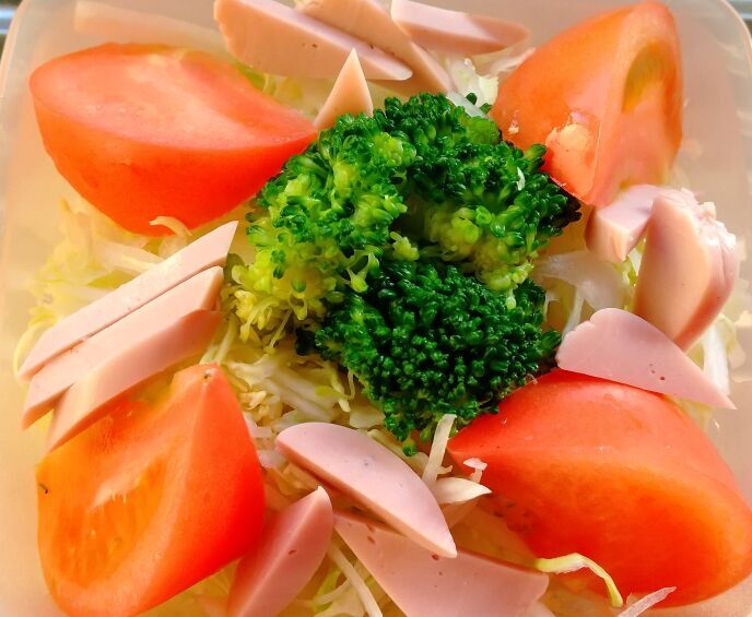 今日のランチのサラダです。朝食でレタスがきれたので、千切りキャベツと千切り大根のミックスの上に、トマトとブロッコリーとフィッシュソーセージを乗せました。以前の画像のカップのきつねうどんと、お総菜の蓮根のキンピラをつけました。少しカロリー的には余裕が有りましたが、帰宅後のベーグル試食のために貯金しました。