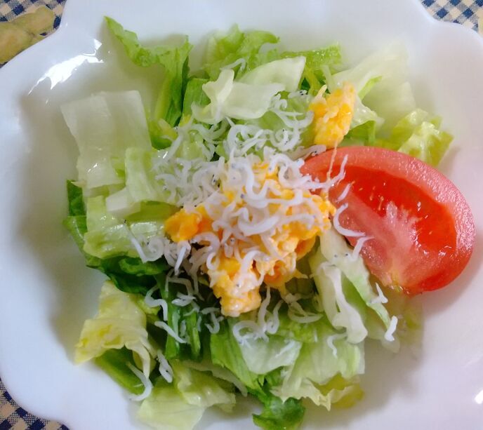 今朝のサラダです。レタスにスクランブルエッグとシラスを散らしました。シンプルですね。