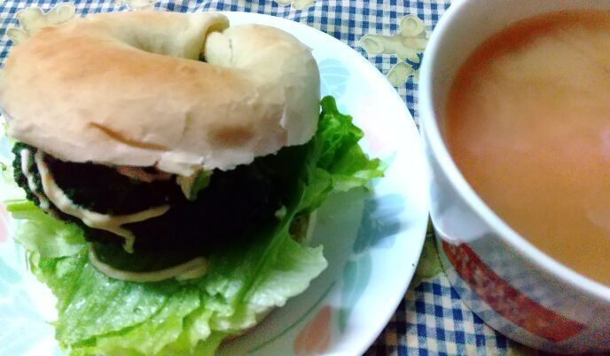 レンジでチンしてオーブントースターでコンガリ。あいにくトマトやハム類が無かったので、レタスとブロッコリーとベーコンを挟みました。コンニャク入りベーグルはごぼう入り。一個192カロリーです。