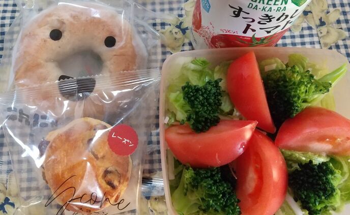 こちらはランチです。今日のサラダはお野菜だけになってしまいました。トマトジュースとベーグルにスコーン付き。スコーンはおやつに回して、お総菜の野菜コロッケをつけました。いつもの様に、約五百カロリーくらいです。