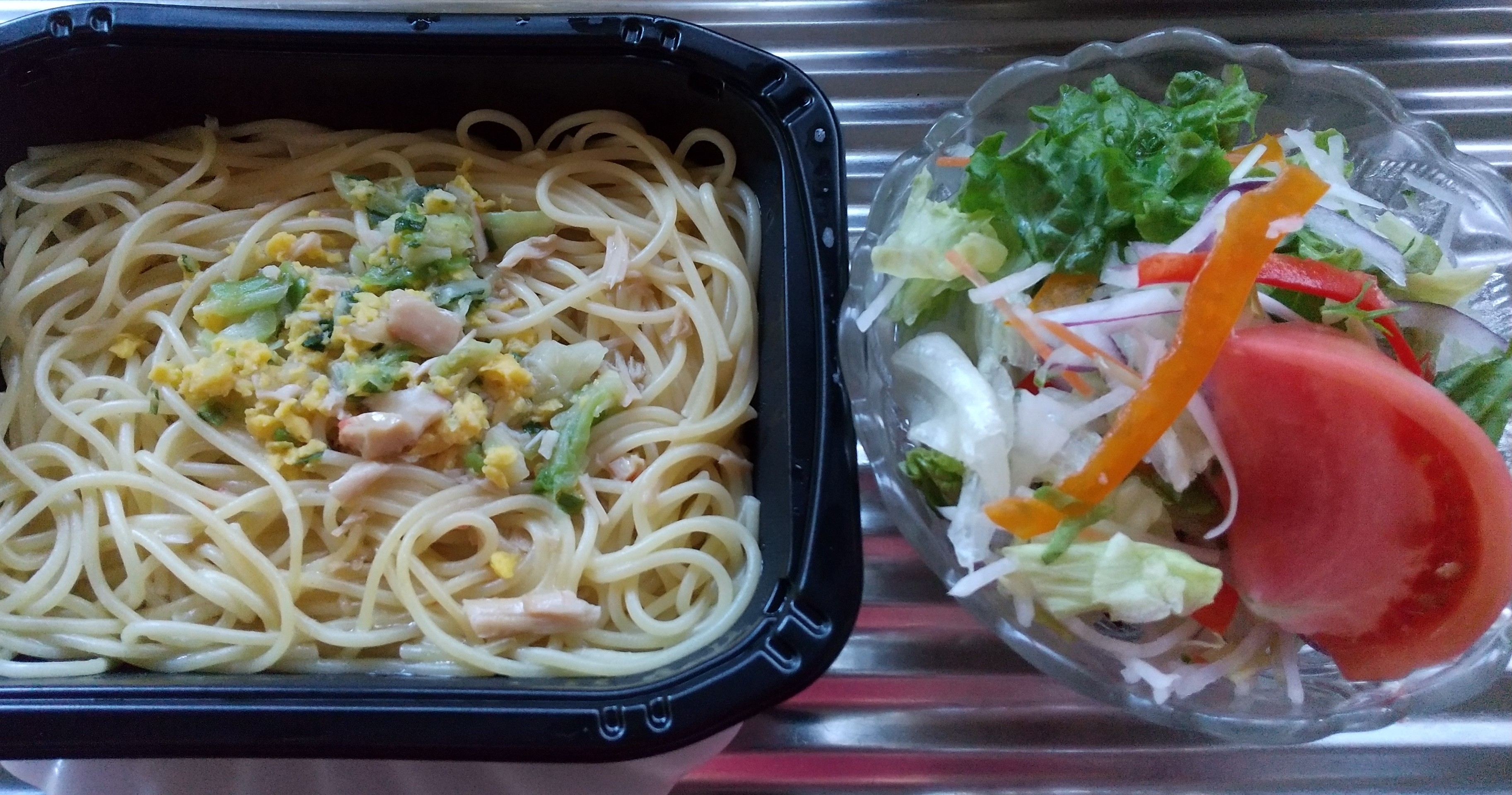 麺が340g入りのBIGシーフード味です。一人前で382カロリーになります。これにサラダをつけました。