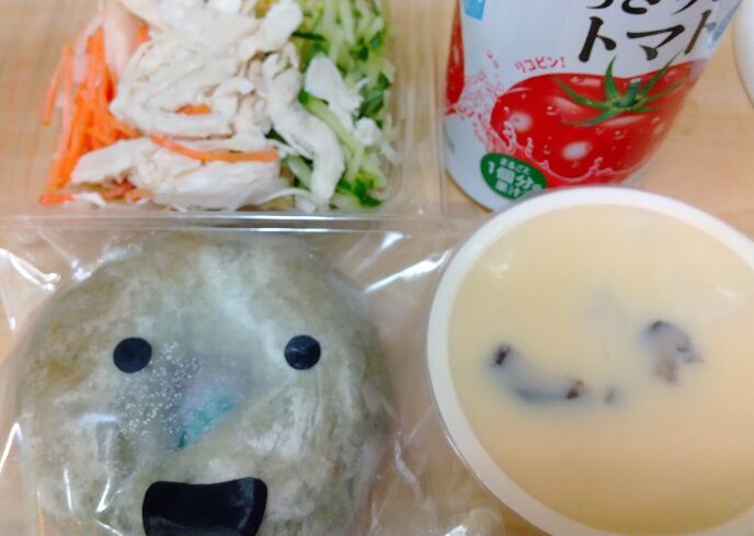 蒸し鶏のサラダにミニ茶碗蒸し。金時豆入りよもぎベーグルとトマトジュースです。金時豆入りよもぎベーグルのカロリーは、一個185カロリーです。あまい金時豆とよもぎの風味がマッチしています。