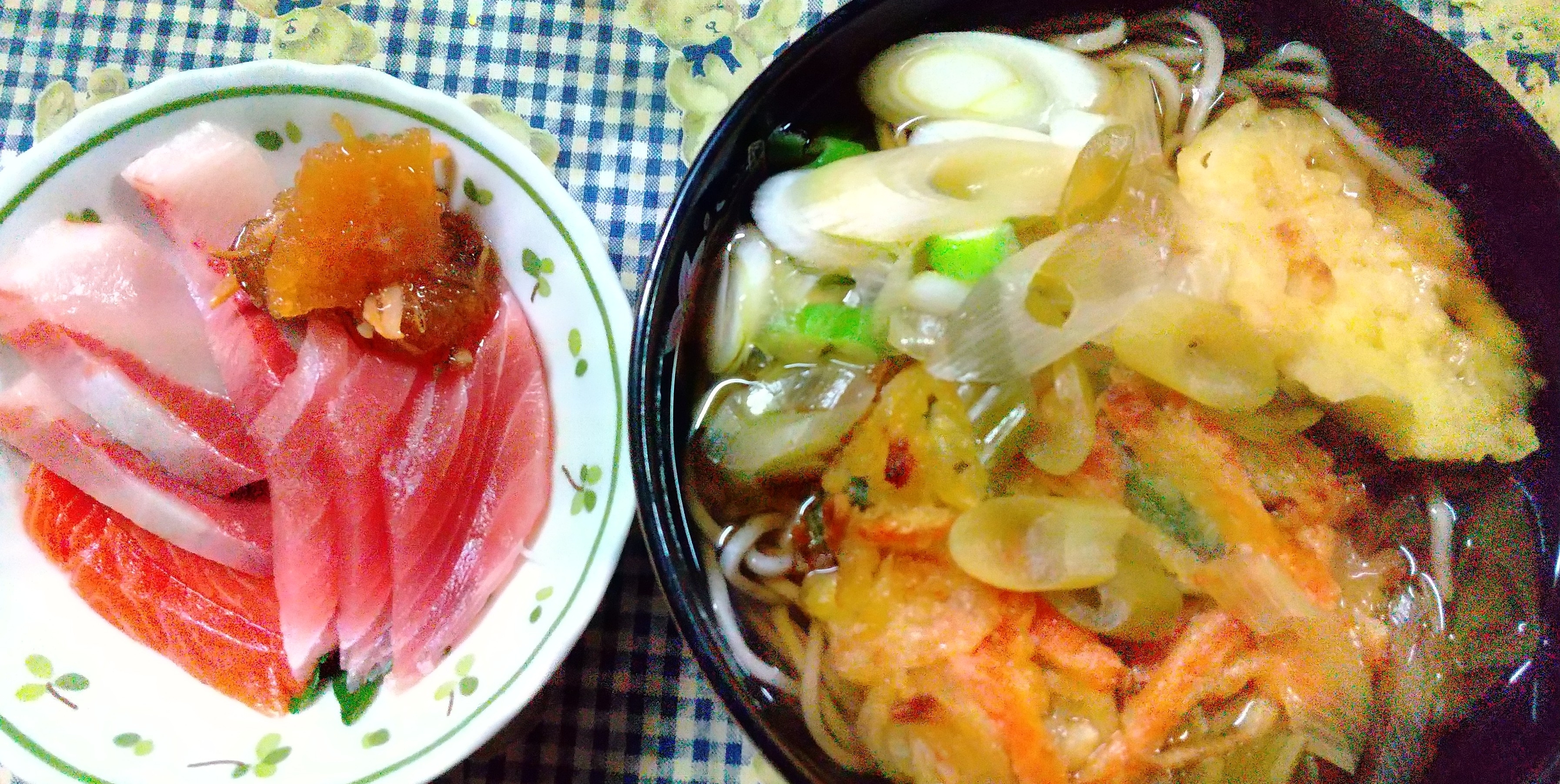 かき揚げとレンコンの天ぷらのせです。500カロリー強くらいかな?お刺身もつけちゃいました。一日換算でオーバーしてしまいました。
