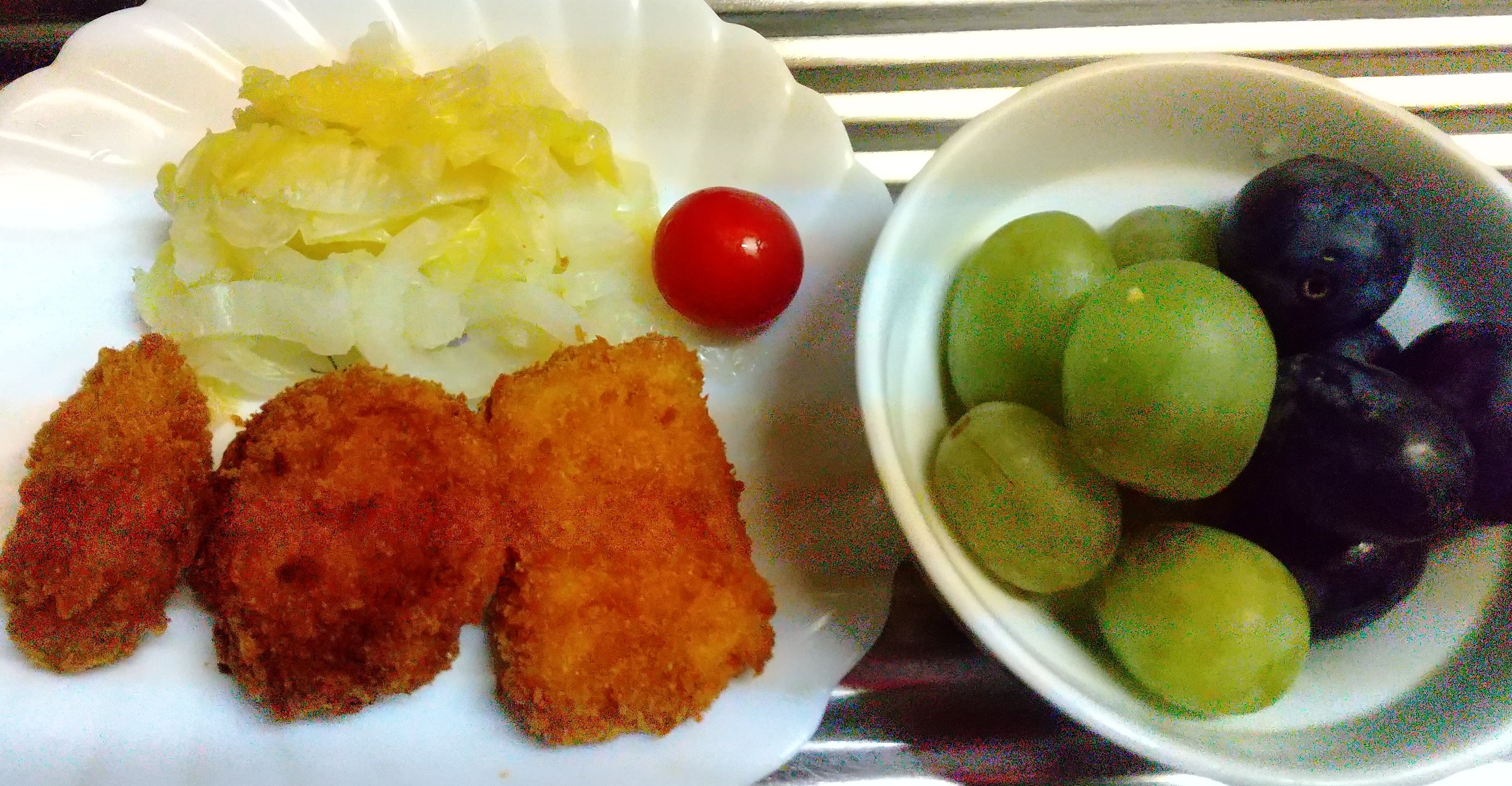 夕食の揚げものとフルーツです。個数が半端だったので私は一つづつ貰い、家族には数を増やしました。