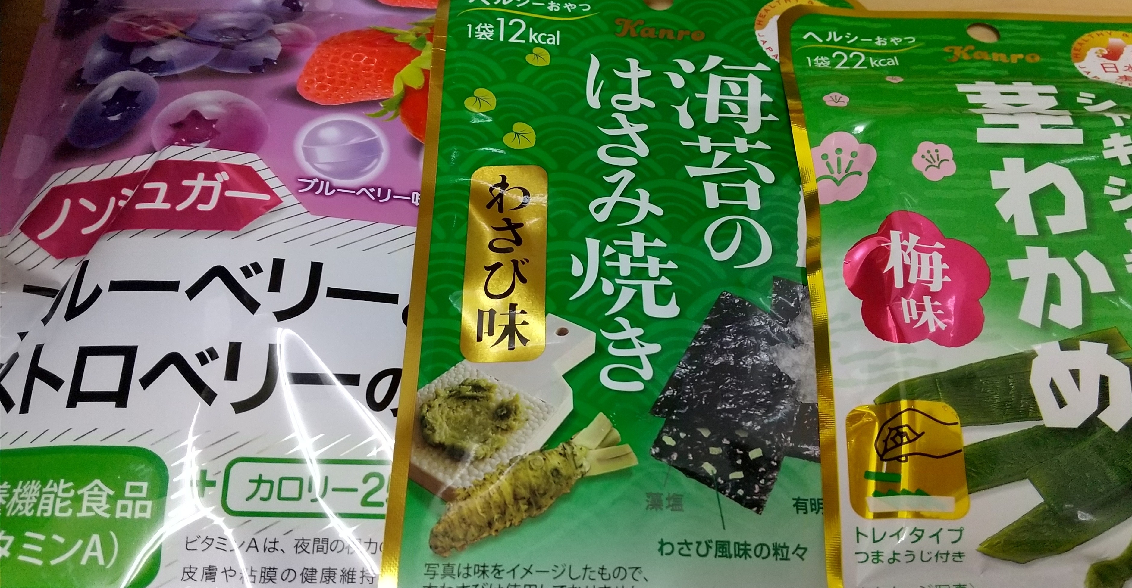口寂しいとき用のおやつです。飴はカロリーが一桁のものを選びました。実は三点とも値引き品です。お安くゲットで美味しく戴きました。