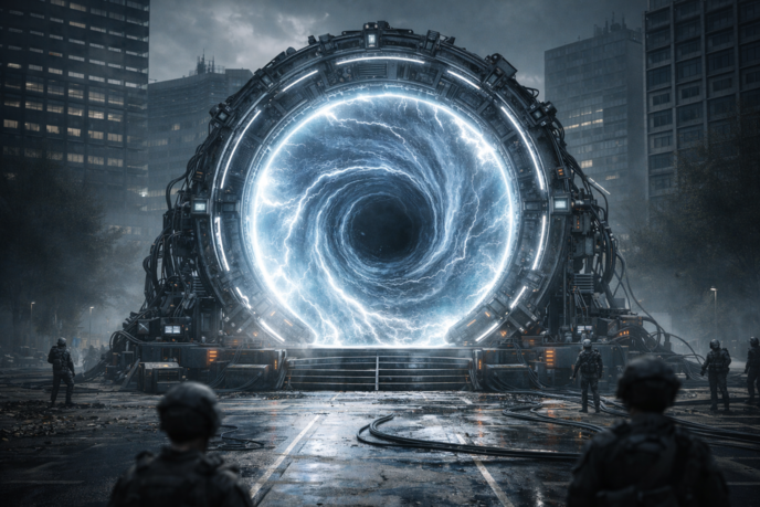 円形のフレームが幾重にも重なり、内部には不安定な光が脈動している。