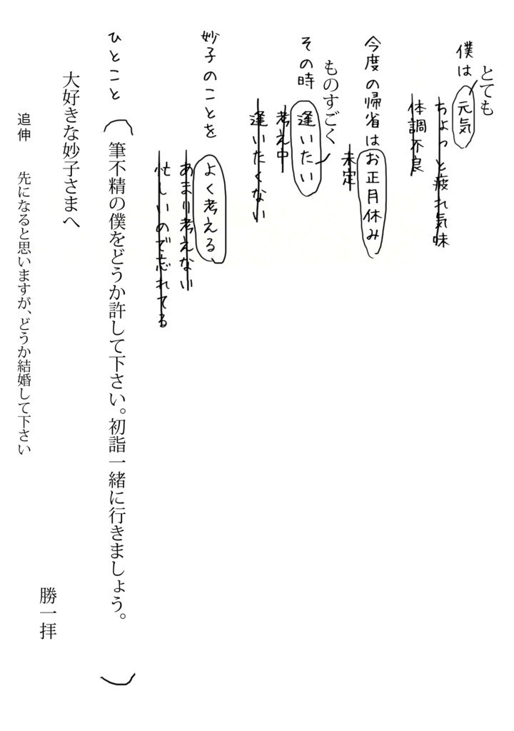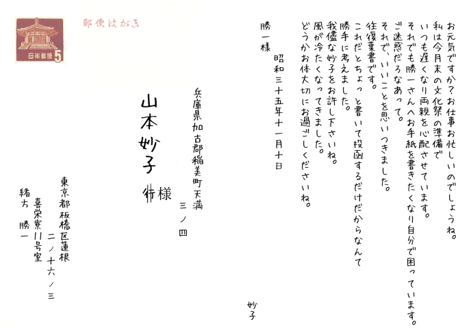 妙子は、ぼそぼそと言いながら、黄ばんだ葉書をなでた。莉奈は、しょうがないなあとでも言いたげに、隅をつまんだ。