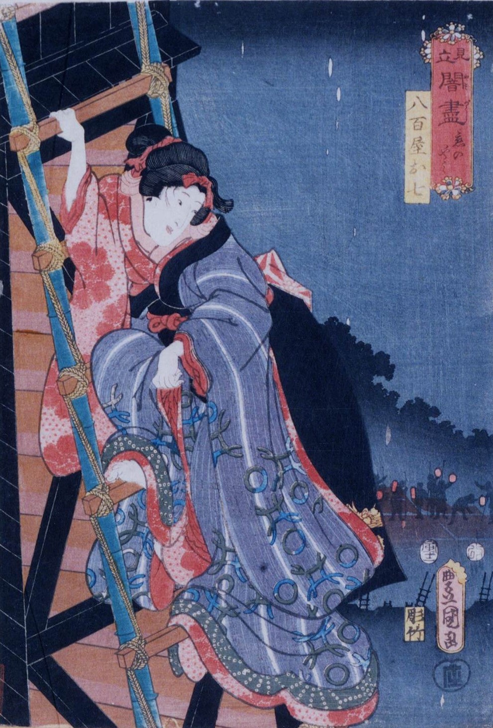 これは覗きカラクリの定番、「八百屋お七」。江戸時代、恋に狂った十六歳の少女が町に火を放ち、火刑に処されたという物語だ。