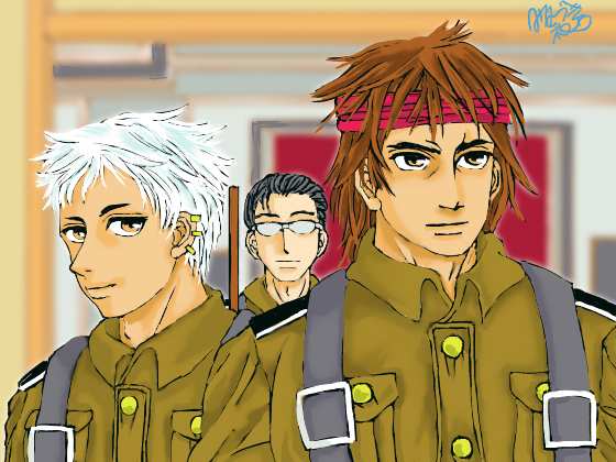 男たちはカーキ色の制服(戦闘服?)を着ていて、腰に付けたホルダーの中に拳銃を収納していた。さらに眼鏡をかけた一人はライフル銃まで所持していた。日本で銃器とは無縁の生活を送っていた少女達は、間近で目にした物騒な武器に言葉を失った。