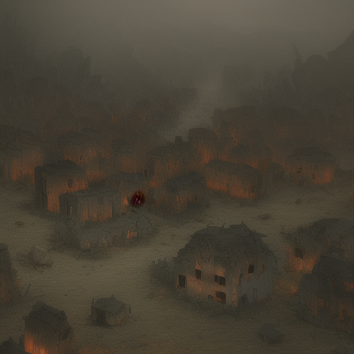 道の向こうに茂っている左右の樹木の切れ目が見え、遠くに炎の明かりが見える。