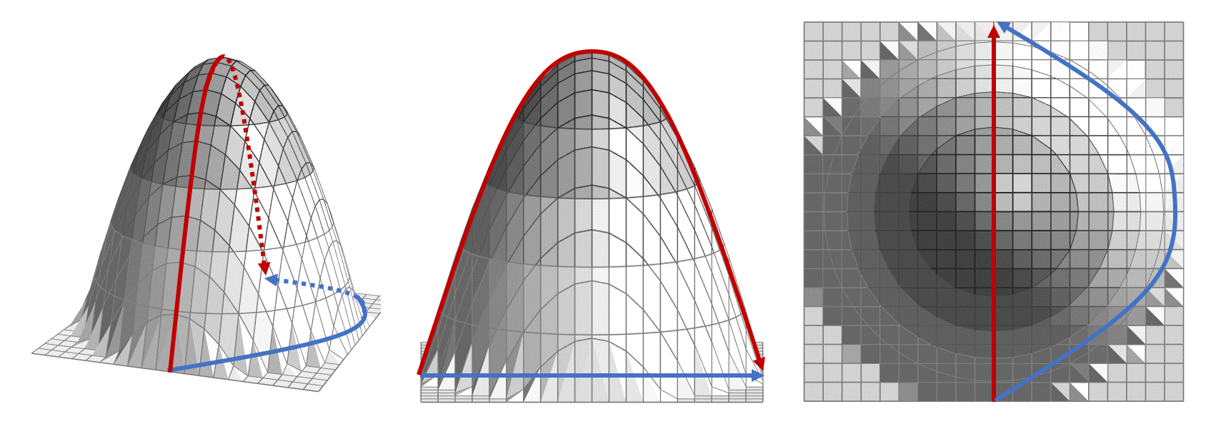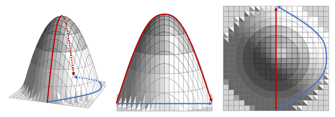 横、縦、奥行きの3次元空間での最短距離は、一般に直線にならない。