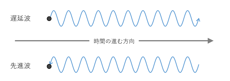 先進波は、遅延波が出る前から出る瞬間にかけて、周囲から波源に向かうので、時間を逆行する波と言える。時間を逆行する波は、時間を順行する僕たちには関係ない波だ。でも、実際に計算ができて、魔法を使えば扱うこともできる。