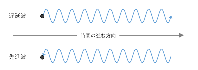 波動という現象には、実は2種類がある。ひとつは波源から周囲に向かって進む波で、水波や音波や光といったふつうにみられる波、遅延波だ。これに加えて、周囲から波源に向かって進む波、先進波がある。