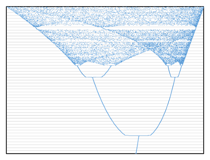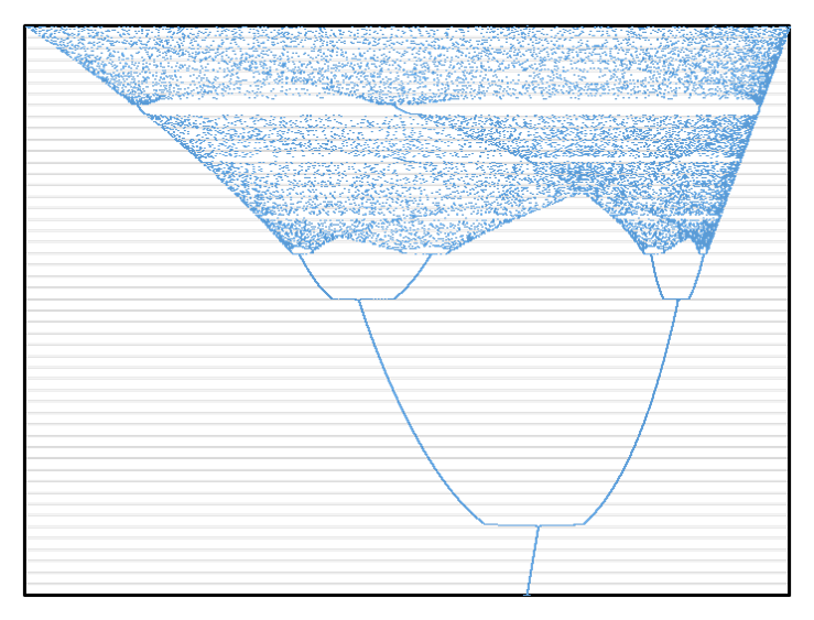 いちばん下から線を辿ると、はじめは単なる分岐だけれど、少し進むと決まった範囲の中に乱雑に点が分布するようになる。かと思えば、いきなり窓が開いたみたいに点が少なくなるところがあったりして、全く先が読めない。