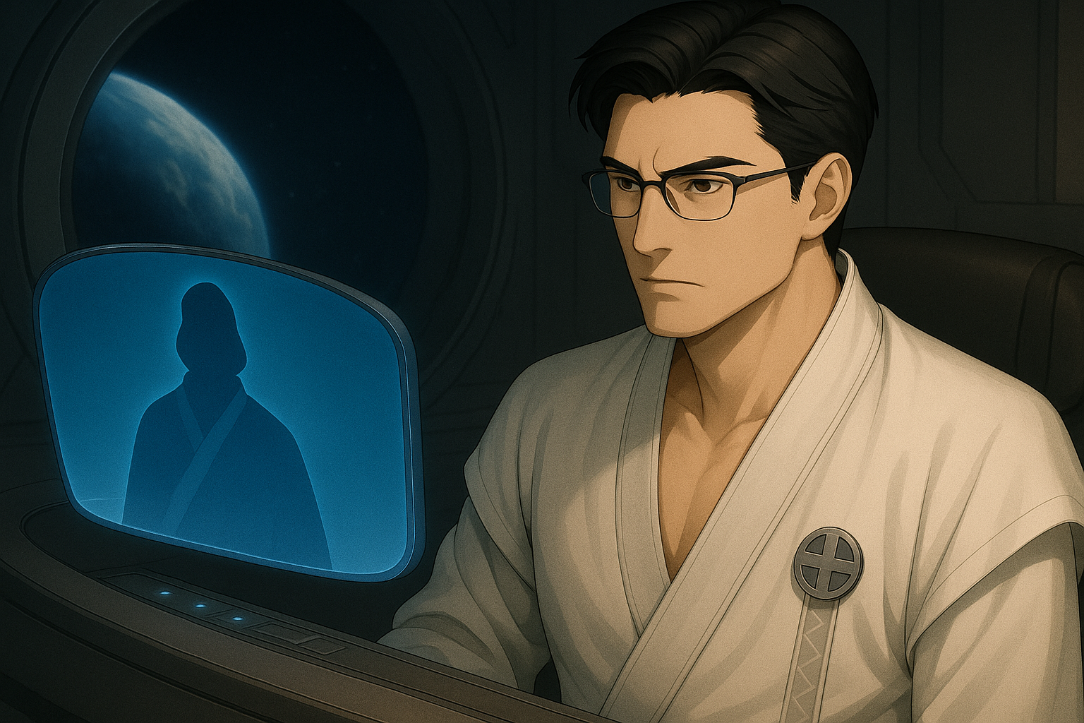 アマツ宇宙軍・上級幹部補佐ユイチ・サイジョウは白銀の袈裟型制服を正し、中央の円形モニターの前に座っている。