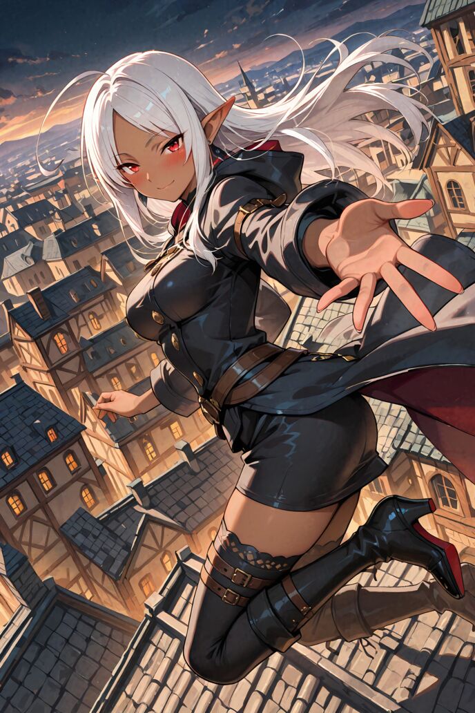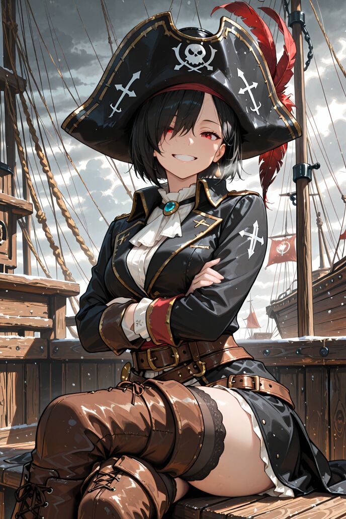 4. 身体的特徴:血のように赤い瞳と、夜の闇を切り取ったような艶やかな黒髪のショートカットが特徴。賞金稼ぎ時代に鍛え上げられた肉体は、贅肉がなくしなやかで、女性的な丸みを残しつつも鋼のように引き締まっている。特に、引き締まったくびれから丸く張り出した臀部にかけてのラインは、男たちの原始的な欲望を煽ってやまない。右目は賞金稼ぎ時代に受けた呪いで邪眼になっており、男たちの欲望をなんとなく読み取ることができる。