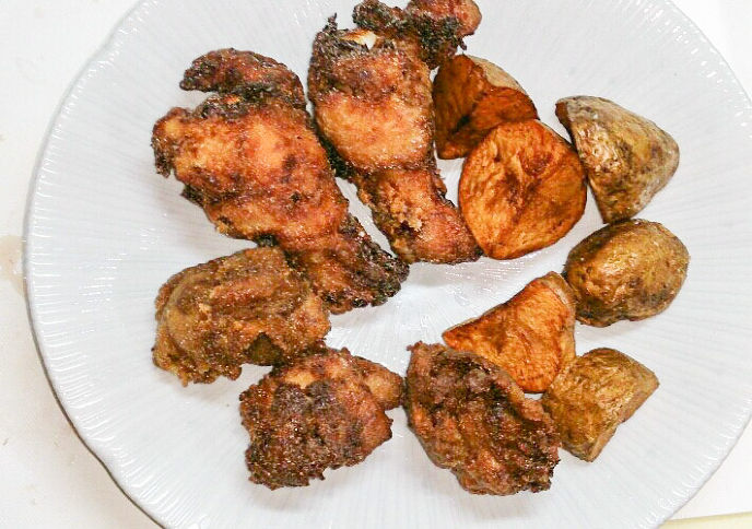 やがて時間になる頃、小麦粉と上新粉を半々混ぜ、唐揚げの要領で手羽元にまぶして二度揚げした。