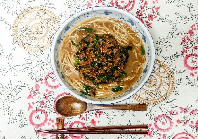後はラーメンのスープに茹でた麺を入れて、最後に肉味噌を盛り付けて出来上がり。