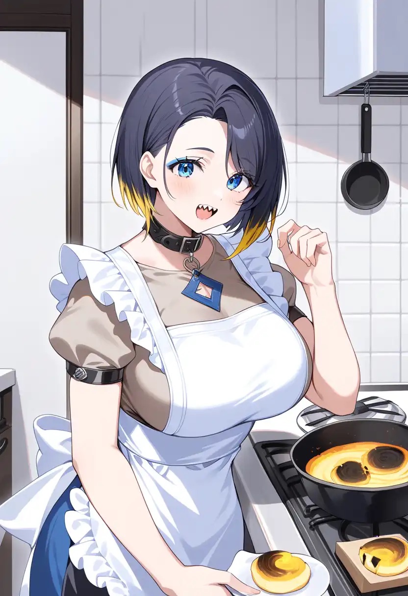 白いエプロンを身につけ、フライパンの前に立つホル。