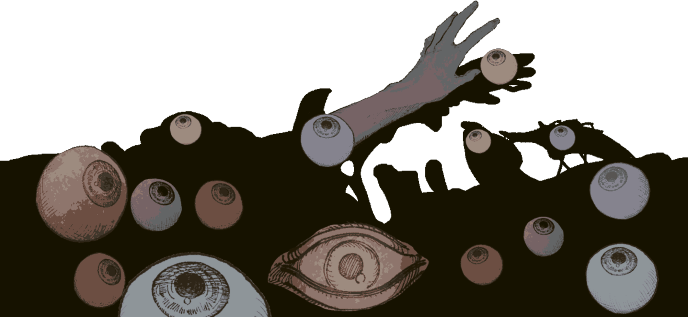 周囲の黒の澱みが、いつのまにか極彩色の目を持って、見ている、覗いている、伺っている、こちらを。