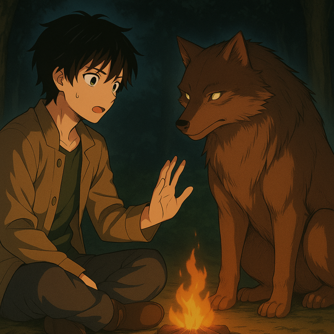 焚火を囲み、狼が横に寄り添う夜。