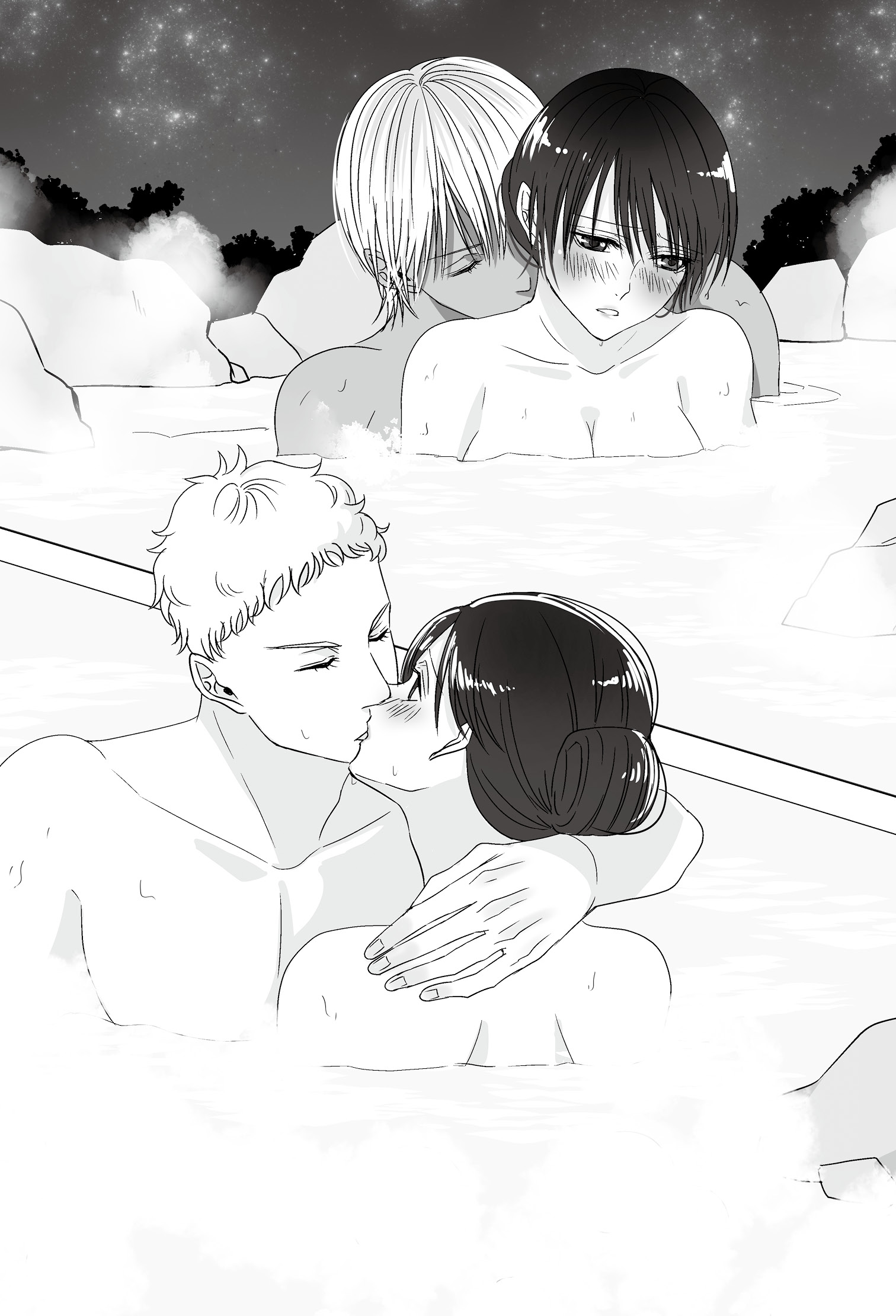 温泉で体が火照っているせいか、お湯から出ていたガルドさんの肩がひんやりと感じられて気持ちいい。重ねた唇の間に舌が入り込んできたので、それに応えていると後ろから項にキスされた。