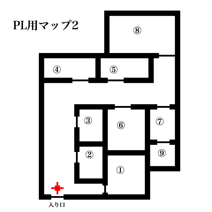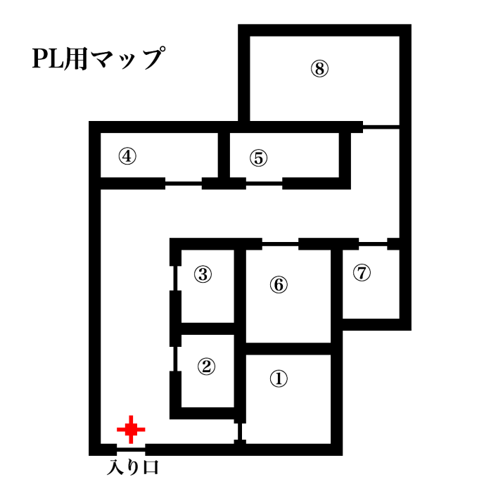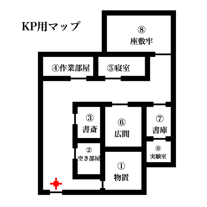 紙人形は人数分、道祖神は確定4つの配置。想定人数1~5人で回すことを想定しているので人形の数は人数に応じて変動。好条件でのクリアを推奨するなら最後の紙人形を似雲に持たせるなども可。今回紙人形は4つの配置としている。アイテム配置はこの限りでなくとも回るので、座敷牢と金庫のインキーさえしなければ配置換えも容易。
