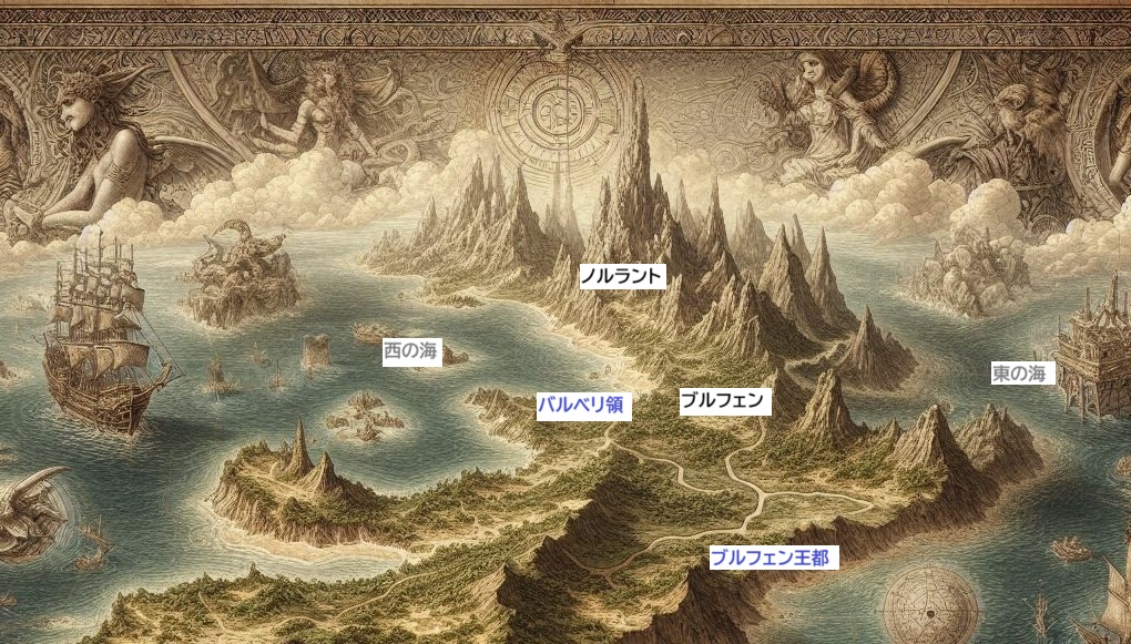 大陸には、北からノルラント、次にブルフェンがあり、ブルフェンより下には、大小さまざまな国がひしめいている。