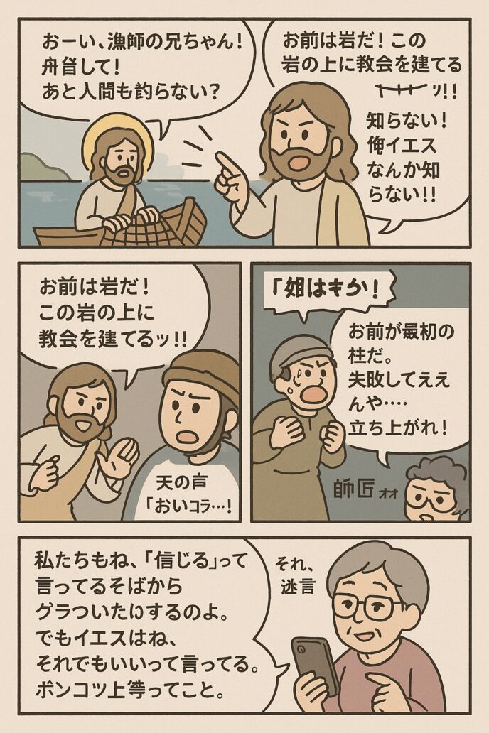 →ひとコマごとに別人レベル!たぶんDALL·Eが「ペテロ=男性キャラ」としか認識してないんだよね💦