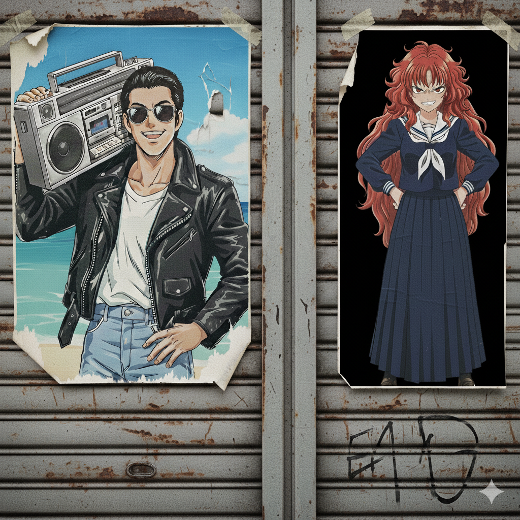 その隣には、長いスカートにパーマの髪、目つきの鋭い少女が不敵に立つ美容室のポスター。それは単なる流行の紹介ではなく、世の中の常識に縛られない、自分らしいスタイルを追求する若者たちの心意気を象徴していた。