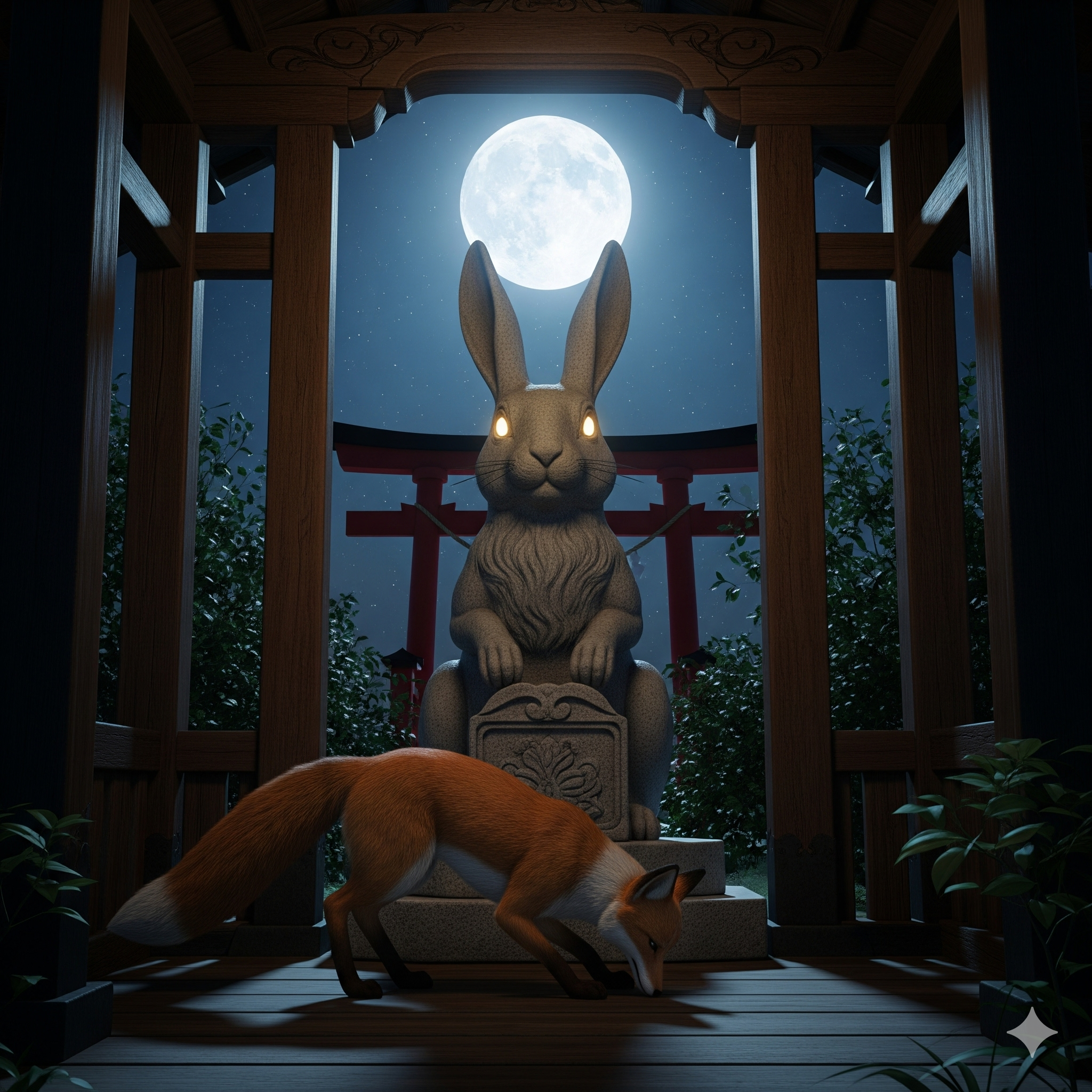 夕焼けに染まる土地を背に、赤茶けたキツネが獣道を駆け抜けていった。その道は、小さな祠へと続いていた。祠は古く、苔むした小さな石造りの鳥居が立っていた。キツネは鳥居をくぐり、隣接する兎神社の本殿へと向かった。本殿の奥深く、月明かりが差し込む場所。そこに白兎の像が静かに鎮座していた。キツネは像の前に深々と頭を下げ、その日の出来事を心の中で像に伝えた。