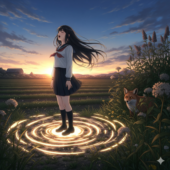 実乃里の視界に、再び目の前の景色が戻ってくる。夕焼けが、広がる田んぼの畦道を、茜色の薄衣のように染め上げていく。風がそっと吹き抜け、枯れた草の匂いがかすかに鼻をくすぐる。遠くで一日を終えた鳥たちがねぐらへと急ぐ声が聞こえるけれど、それはもう、この世界の音ではないようだった。