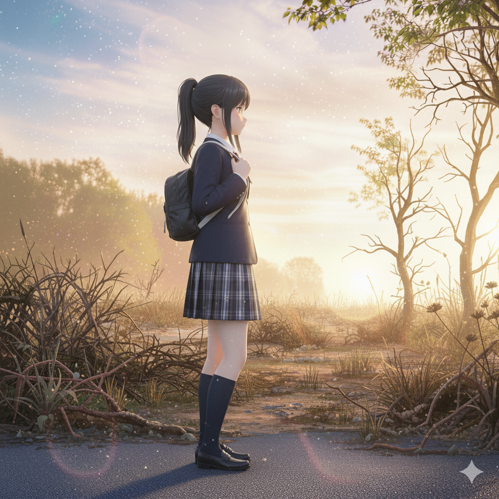 翌朝、実乃里はいつもの通学路を歩いていた。澄み切った空の下、柔らかな朝の光がアスファルトを照らす。鳥の鳴き声だけが響く静寂の中、木々の匂いや、いつもの清々しい空気、田んぼの脇を流れる清らかな水の気配を胸いっぱいに吸い込む。