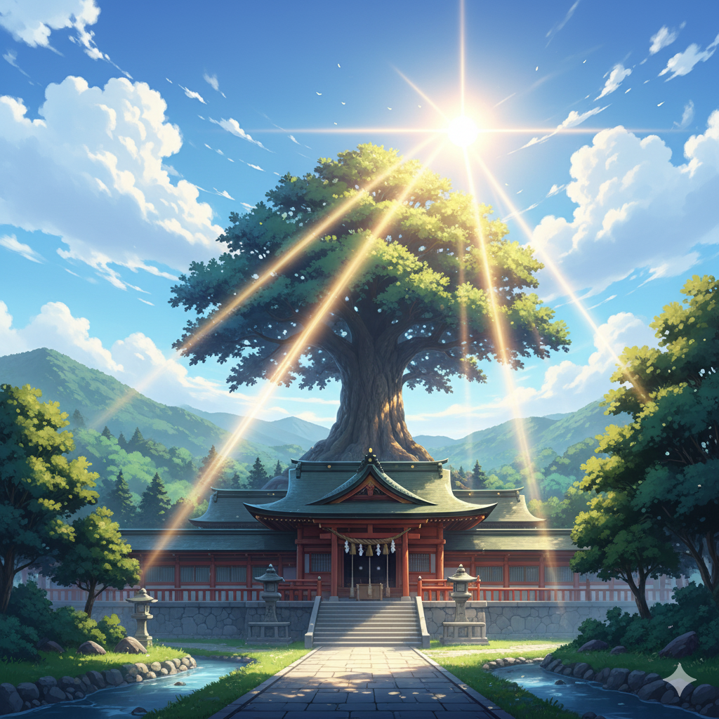 「ね、あの雲の隙間から漏れてくる光、山のふもとの神社の御神木に当たって、すごくきれいだなって思ってたの。」
