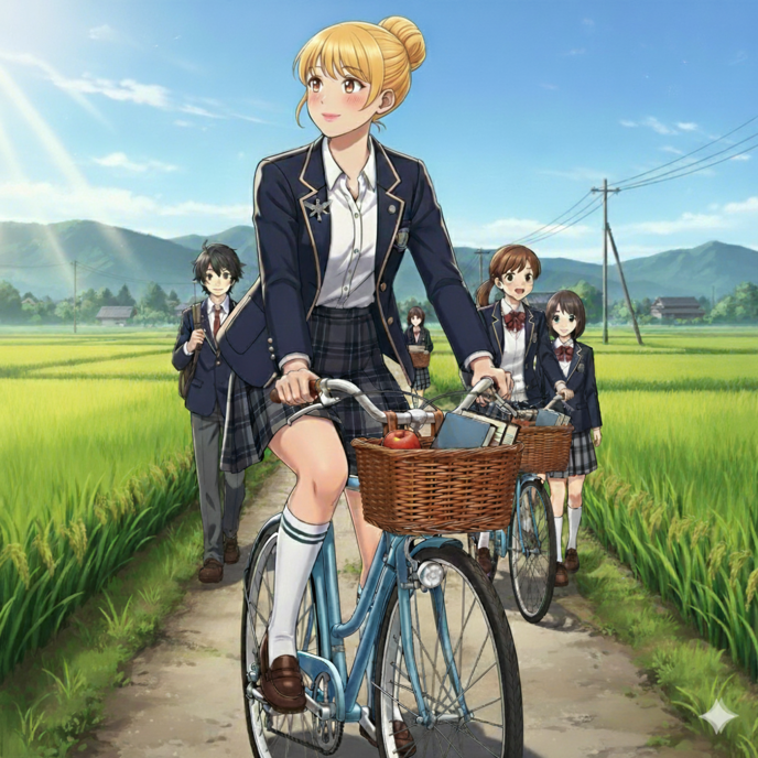 空をぼんやりと見上げる実乃里の背後から、軽やかな守屋夏(もりやなつ)の自転車のベルが響く。颯爽と隣に並んだのは、幼なじみの夏だった。この田舎町とはまるで違う、都会のファッション雑誌から抜け出してきたような、華やかな少女だ。夏は、ひいおじいさんが外国出身だというだけあって、彫りの深い顔立ちと透き通るような肌を持ち、実乃里の黒髪と対照的な明るい金髪と相まって、この田舎町の風景の中では浮き上がって見えた。彼女の髪からは、甘いフローラル系のシャンプーの香りがふわりと風に乗った。