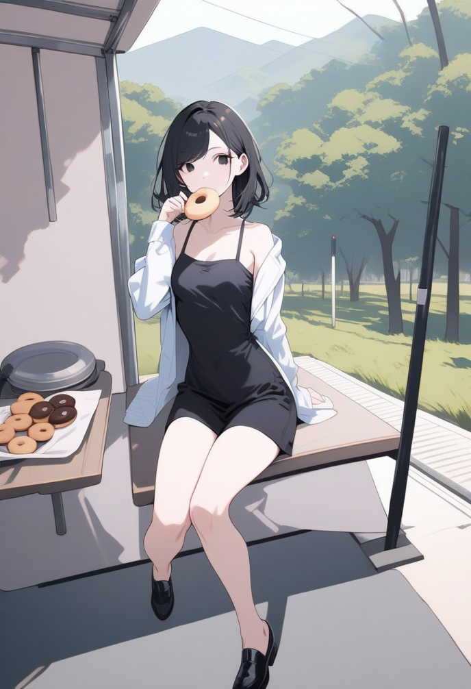 仕切りもなく多少の日除けは全ての日差しを防いではいない仮設の休憩所に入ると、先に休んでた妃夜さんがドーナツにかぶりついているところだった。