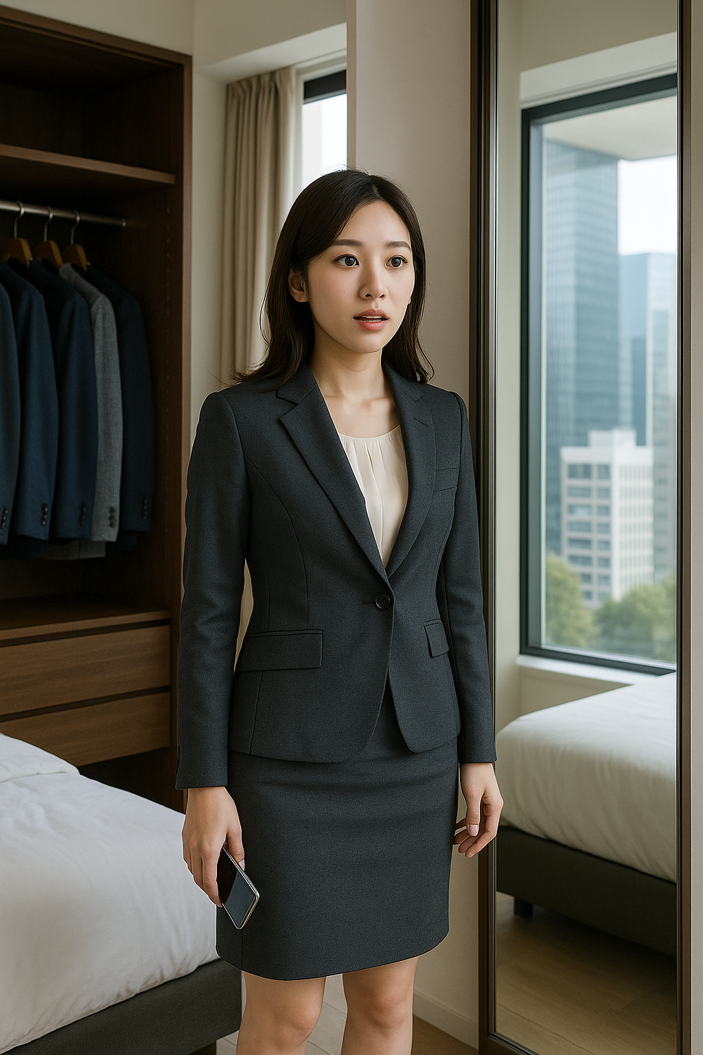 美月(中身:志穂)は、タワーマンションの一室で目覚めた。最新のスマホ、クローゼットに並ぶ高級ブランドのスーツ、何より鏡に映る完璧な自分の姿に圧倒される。