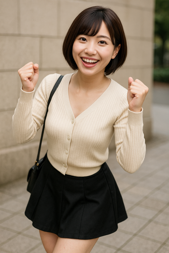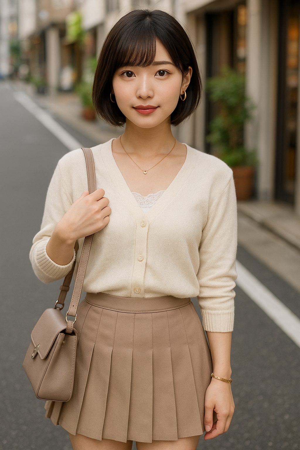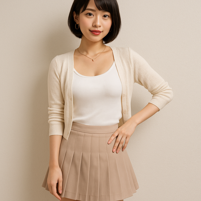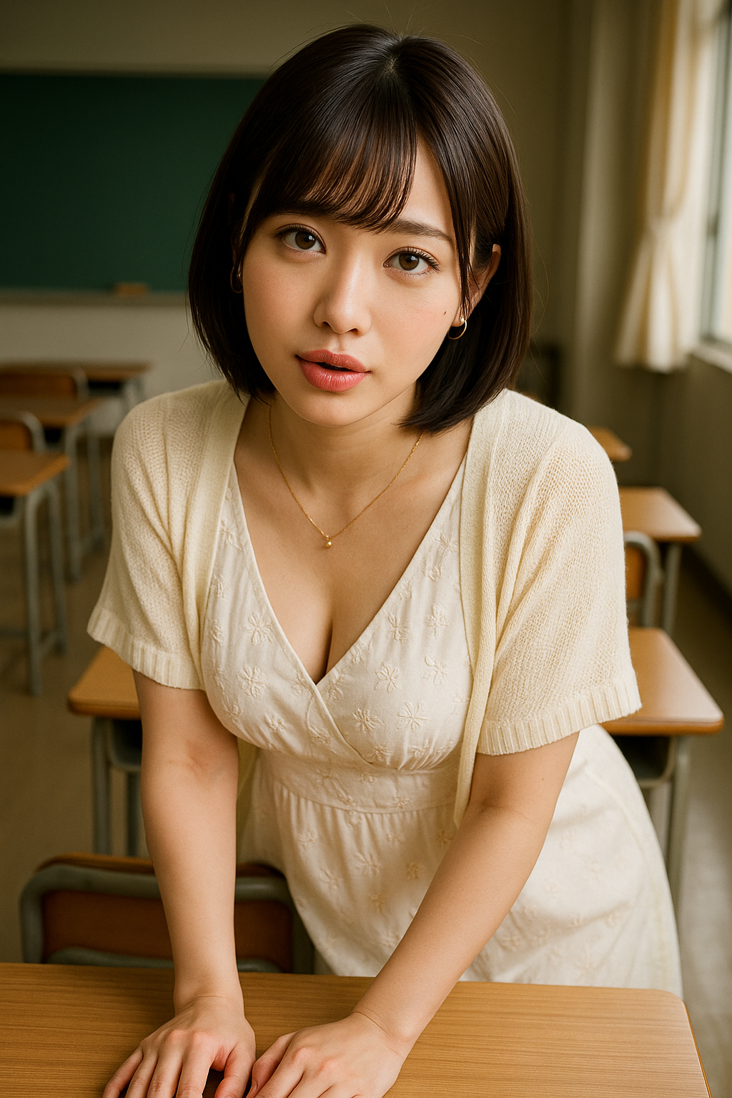 放課後、職員室を出ると、彼女はさっと髪を整え、清楚系ギャルの装いに身を包む。透け感のある白ブラウスに、柔らかなベージュのカーディガン。プリーツスカートに華奢なアクセサリーを合わせ、ぷっくりとした唇にはほんのりピンクのグロス。学校での厳しさとは正反対の、親しみやすさと可愛らしさを併せ持つ「清楚系ギャル」の姿へと変わるのだった。