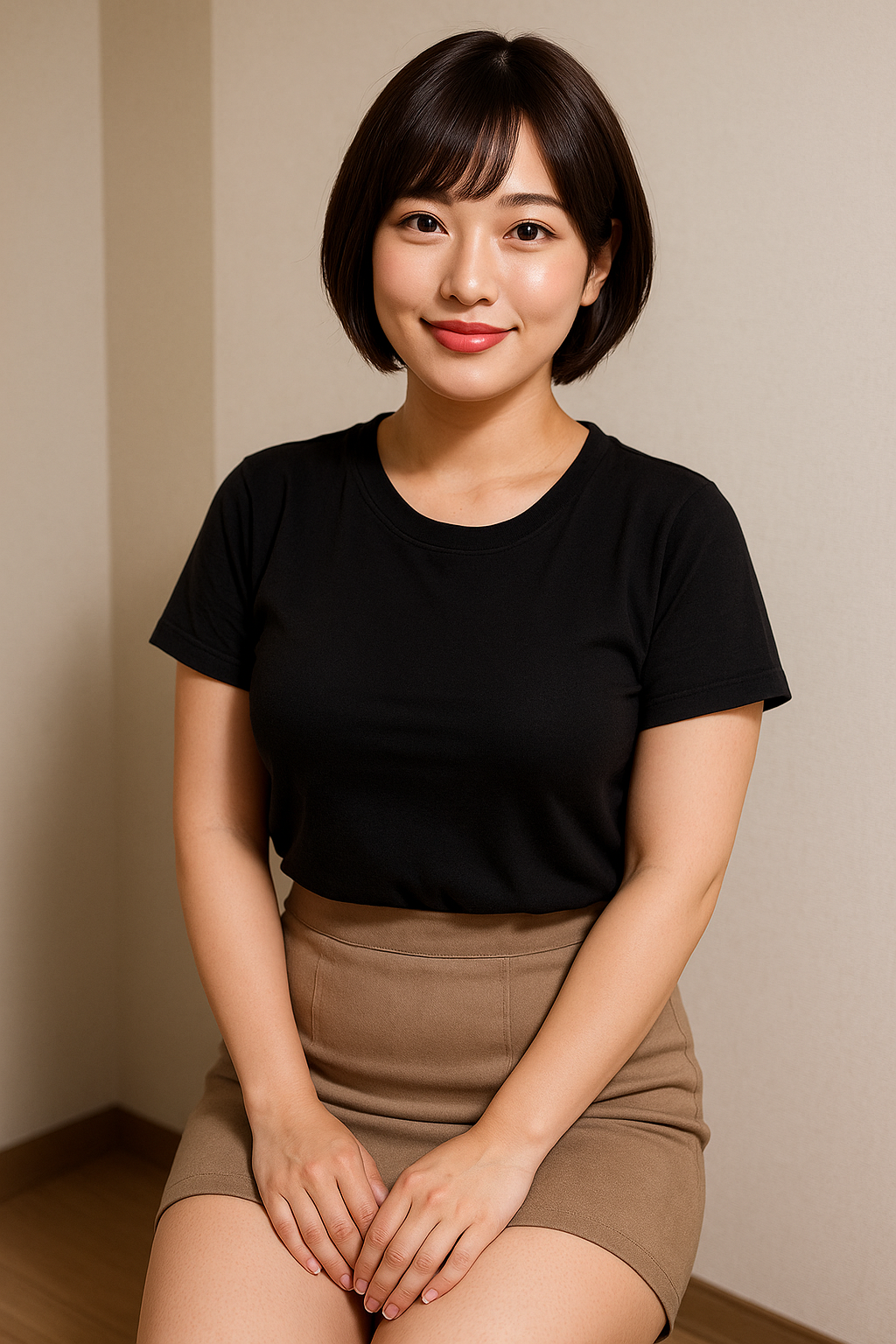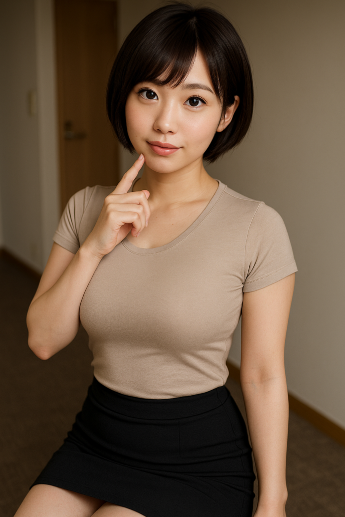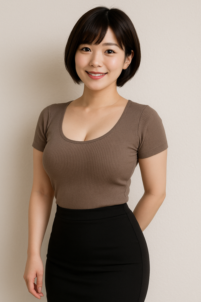 白のブラウスにタイトスカート、ショートボブが揺れるたび、ぷっくりした唇が光を拾う。
