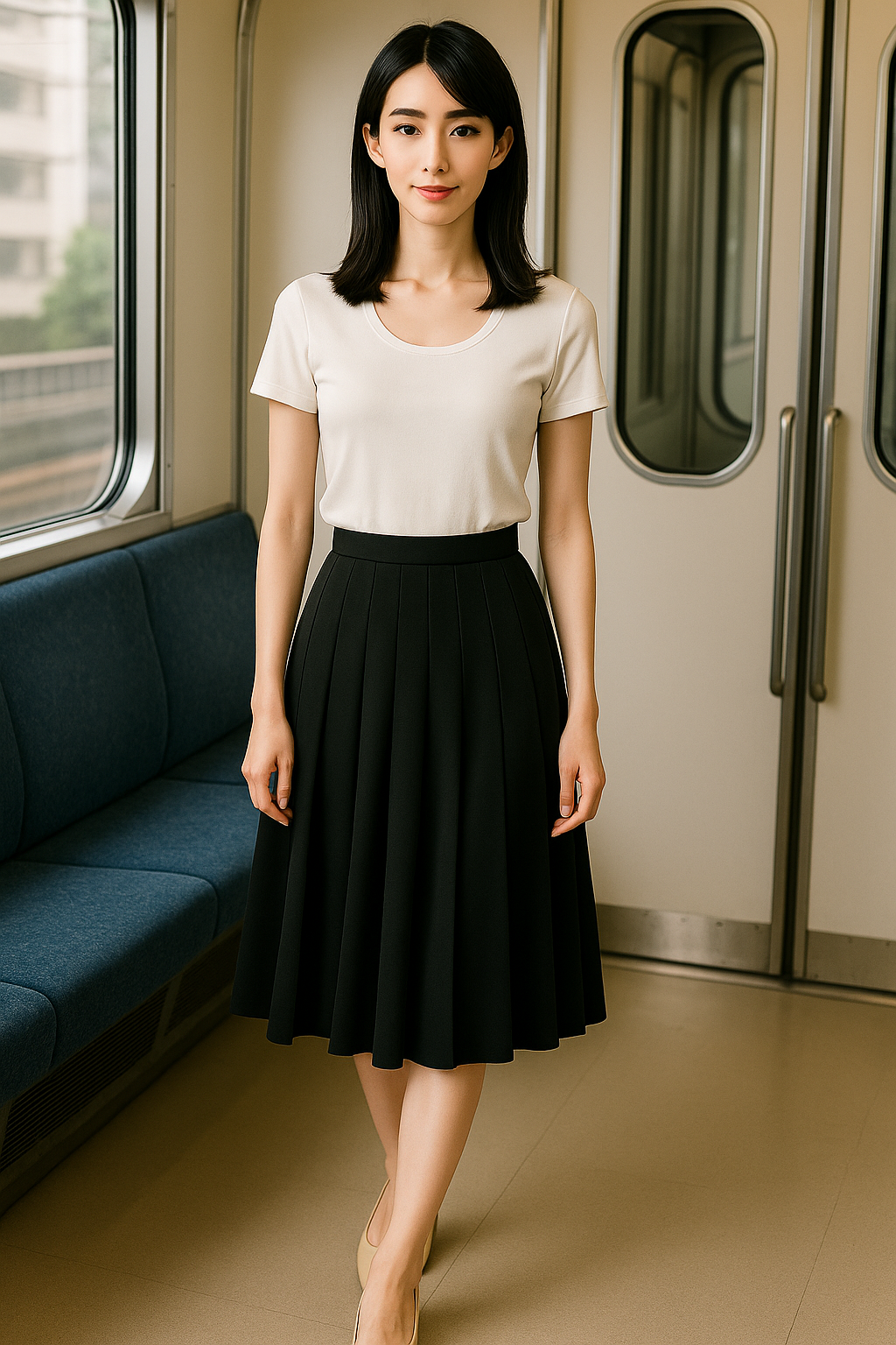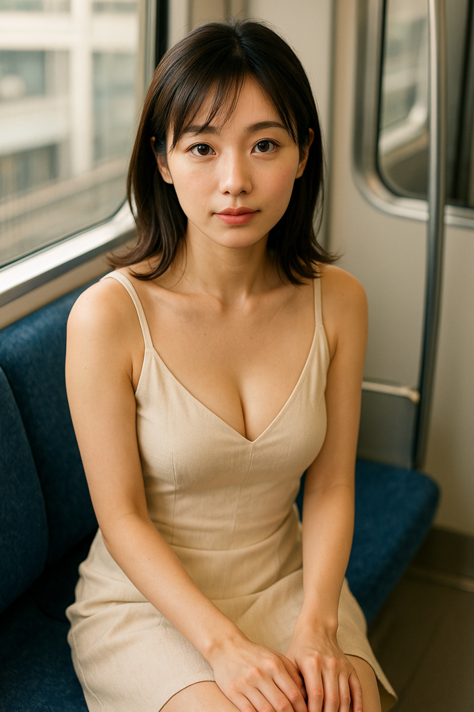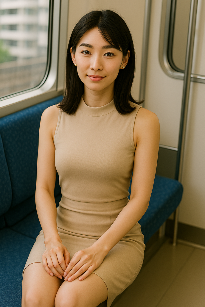 都心を走る電車の車内。夕暮れの柔らかな光が窓から差し込み、座席に座る一人の女性の肌を照らしていた。