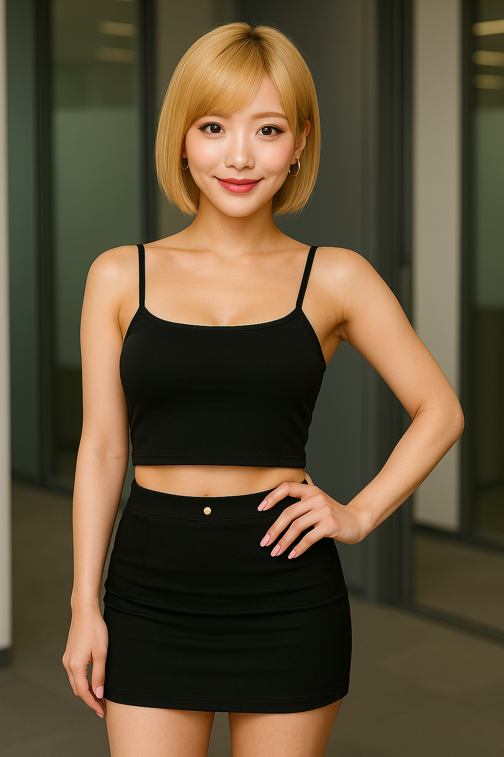 にっこりと微笑む玲奈。黒のキャミソールとタイトスカートというオフィスでは異彩を放つ姿なのに、不思議と嫌味がなく、むしろ自信に満ち溢れていて格好いい。