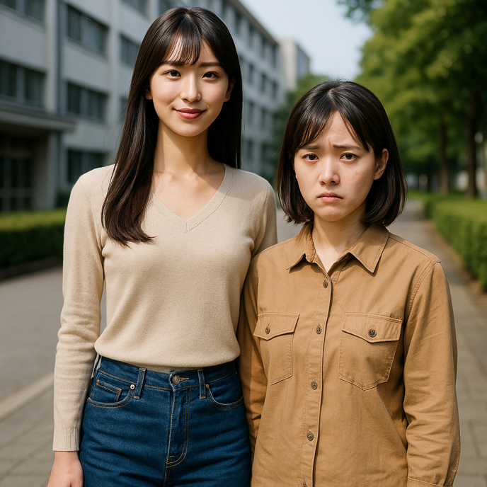 大学の廊下で、二人が並ぶ姿を見た男子学生たちの声が漏れる。