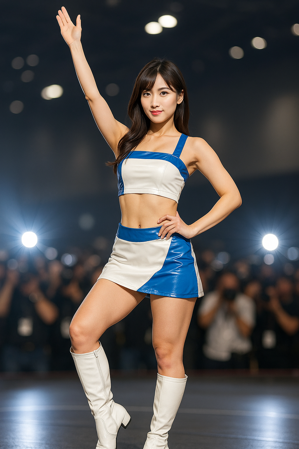 腰をひねり、片足を軽く前に出し、片手を高く掲げる――その動きには、観客を魅了するプロとしての自信と誇りが満ちている。