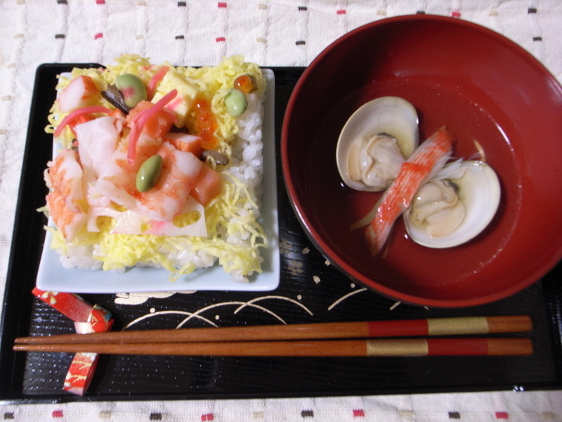 ひな祭りの料理ちらし寿司(左)と蛤の吸い物(潮汁)(右)