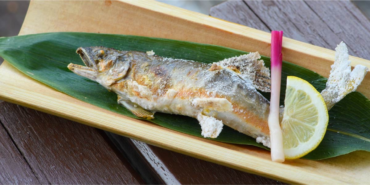 「へい、お待ち。鮎の塩焼き。どうぞ。」