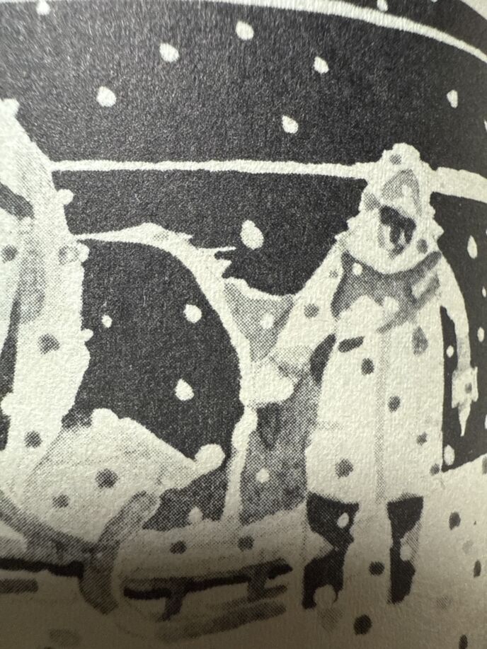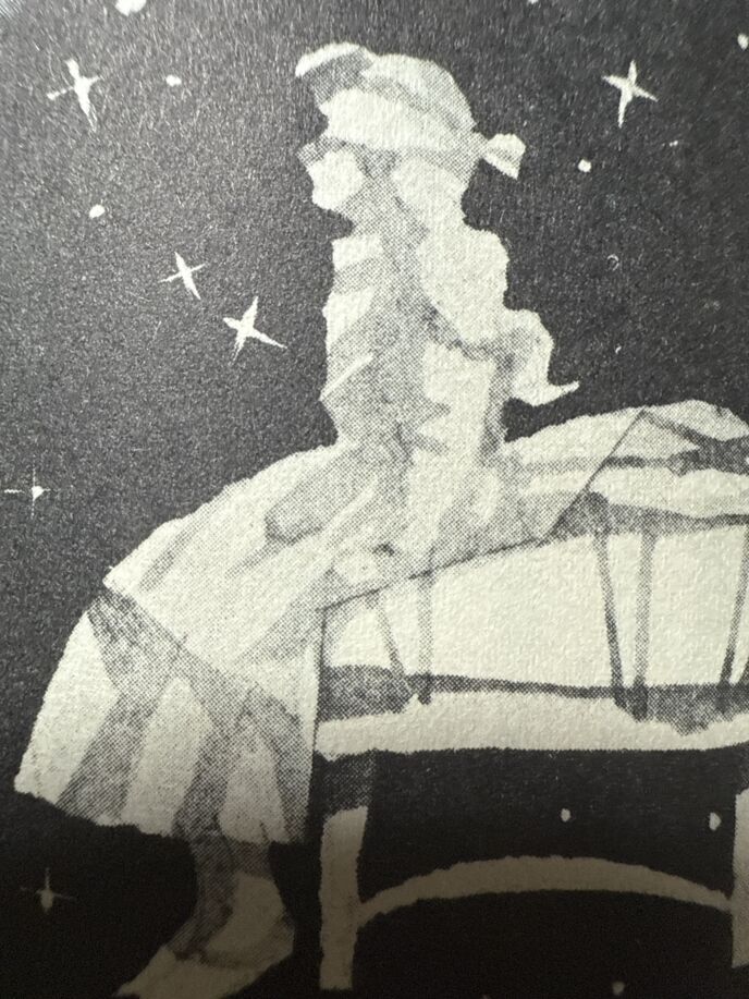 木切はお父さん、欠けた土瓶はお母さん、糸巻きや、小さな瓶は兄さんたちです。木切のほかは、みんな桶(おけ)の中にいて、仕事をしたり遊んだりしています。星むすめは桶の中のおもちゃとお話をしたり、歌を歌ったりしました。でも、その歌を聞いてくれるのは、猫🐈だけでした。星むすめがこの家へ来てから、ちょうど三ど目のクリスマスが近づいていました。