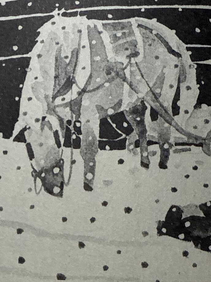 旅から帰ったばかりで、とても疲れていましたが、また、ソリ🛷に馬をつなぎました。それから、隣のムッラのおかみさんを呼び出して、無理矢理ソリに乗せて、星むすめを捨てたところに案内させました。山に着くと、二人は、ソリから降りてスキーを履き、雪の積もった上を越えていきました。ムッラが星むすめを置き去りにしたところに来てみると、そこには、まだ、星むすめの寝ていた、小さな窪みがありましたが、星むすめの姿は見えません。