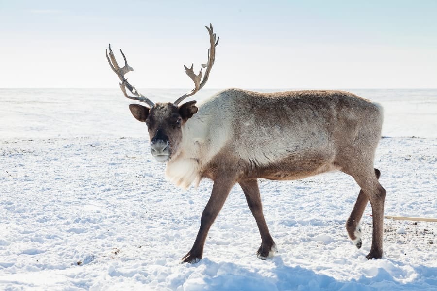 その少女は茶褐色と灰色のまだら色のトナカイの背中に乗っていました。