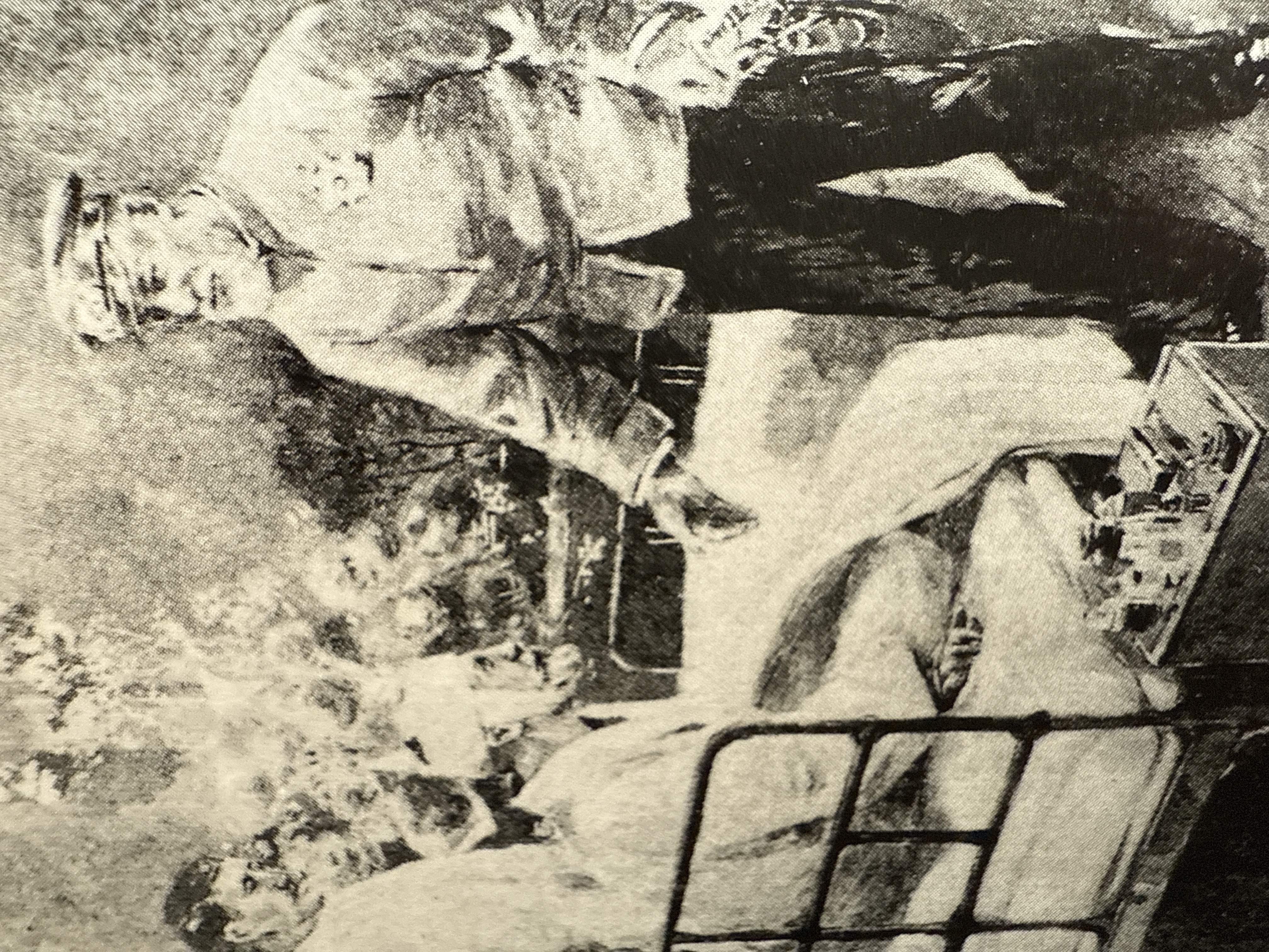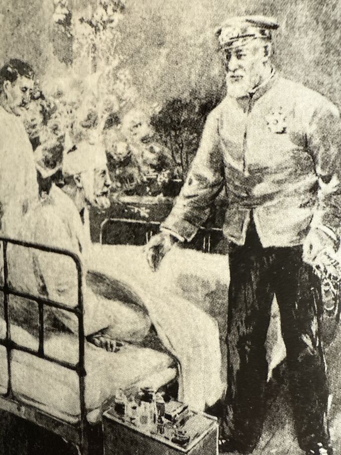 日本連合艦隊駆逐艦「漣の捕虜になり、佐世保海軍病院に収容された重傷のロジェストウェスキー中将を見舞う東郷平八郎大将(絵)。