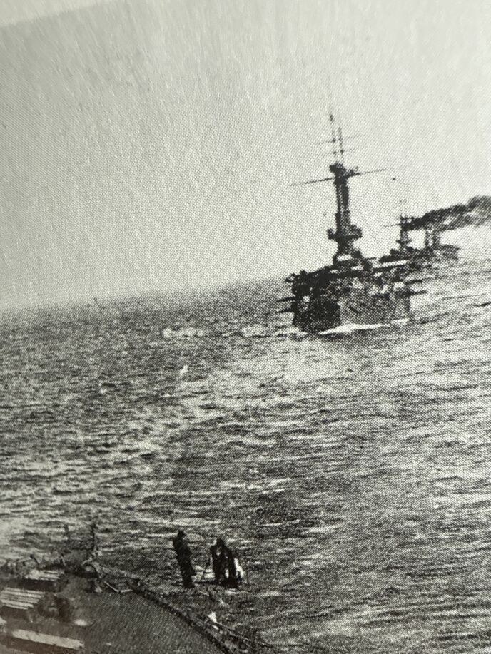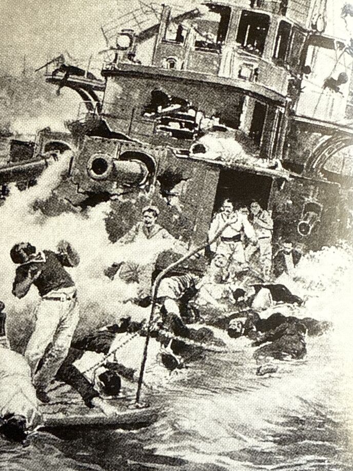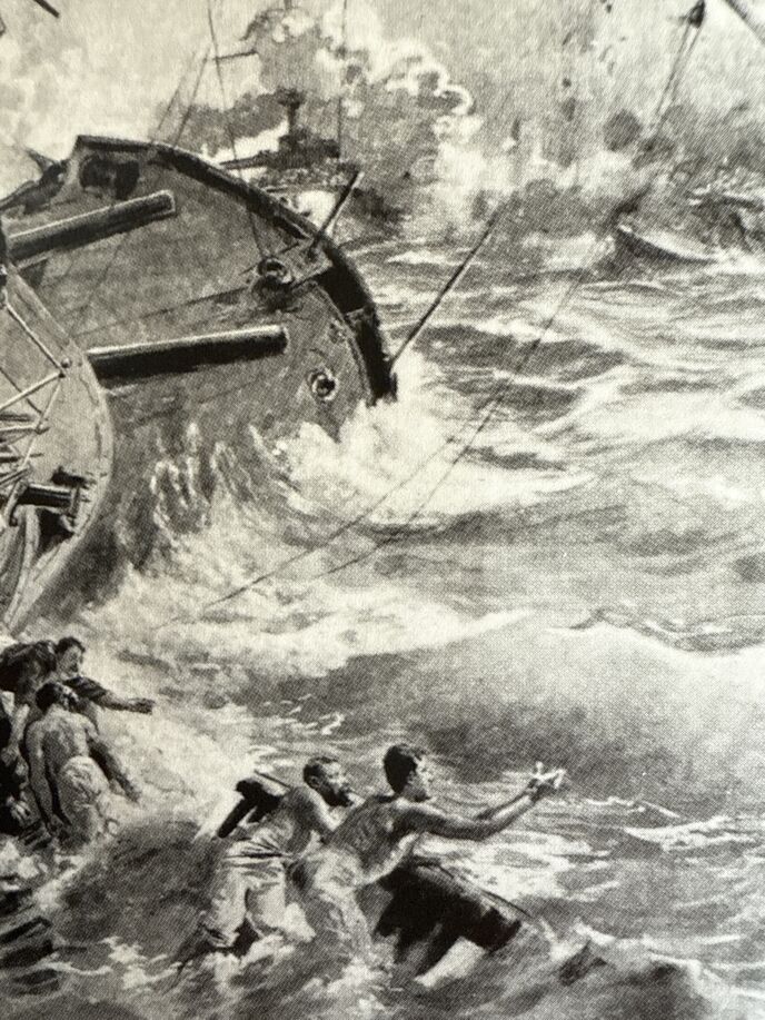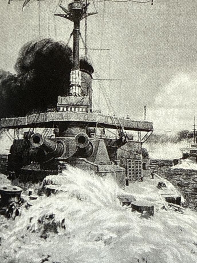 5月27日午後2時半過ぎ、戦艦「オスラビヤ」(手前)「スワロフ」などロシアの主力艦隊は砲撃により猛火に包まれた。